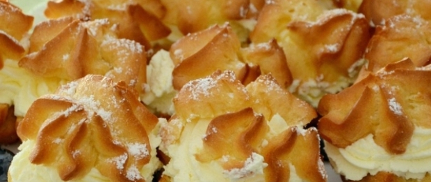 - Větrníky rozkrojíme a spodní část naplníme vanilkovým krémem, na něj nastříkáme karamelovou šlehačku a přiklopíme vrškem. Posypeme moučkovým cukrem, nebo přelijeme karamelovou polevou.