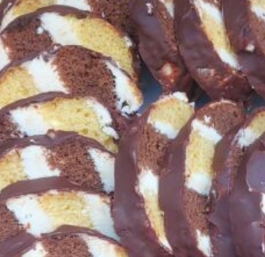 - Vychladlé korpusy nakrájíme na stejné kousky. Ty poté střídavě skládáme za sebe a spojujeme připraveným krémem, čím vytvoříme typický dlouhý koláč.